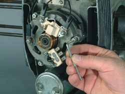 * If your stator was received from Motorrad Elektrik fully assembled, there will be a brush retainer pin fitted through the bottom of the brush holder. This holds the brushes up safely out of harm's way until the stator is fully installed. Then, pull the pin and the brushes will snap into place.